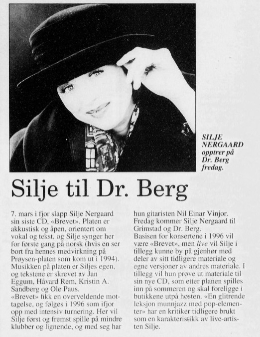 ''The Letter" was received overwhelmingly, and is followed up in 1996 as last year with an intensive tournament. Here, Silje will primarily play at smaller clubs and the like, and with her is the guitarist Nils Einar Vinjor. On Friday, Silje Nergaard comes to Grimstad and Dr. Berg.