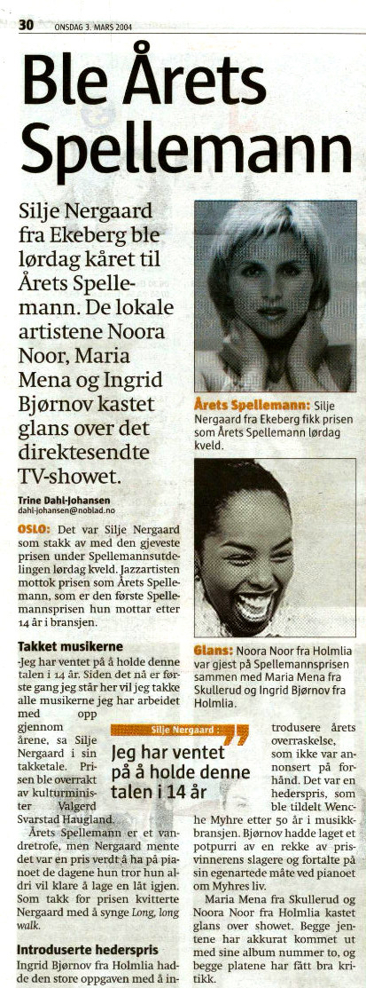 Silje Nergaard from Ekeberg (in Oslo) was named ''Spellman (Artist) of the Year'' on Saturday. The local artists Noora Noor, Maria Mena and Ingrid Bjørnov shone on the live TV show.